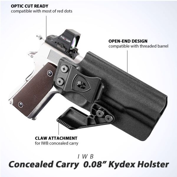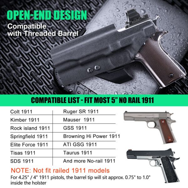 Compatible with 5″ 1911 Pistols (No Rail) – Inside-waistband Kydex holster, custom-molded for Colt 1911 .45 ACP 5″ No Rail and compatible with Colt, Kimber, Springfield, S&W, Ruger, Taurus, Rock Island, Tisas, RIA, GSG, Mauser, Browning Hi-Power, Caspian Arm, and other 1911 models. Ensures secure fit, reliable retention, and maximum concealment.
