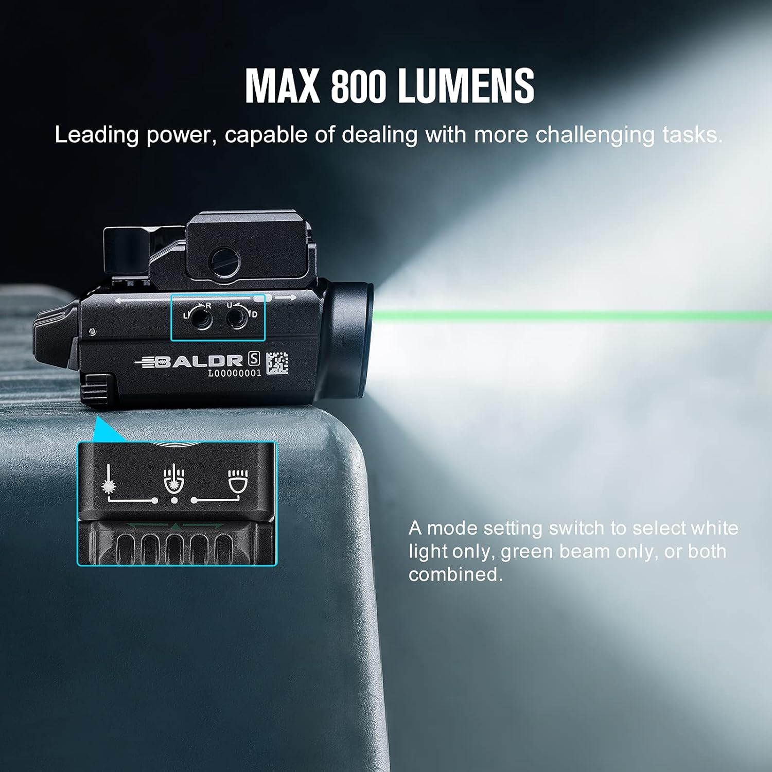 - The Baldr S is one of the most powerful compact light/green beam combos on the market. Its white light output goes up to 800 lumens and is complemented by a low 100-lumen setting.
